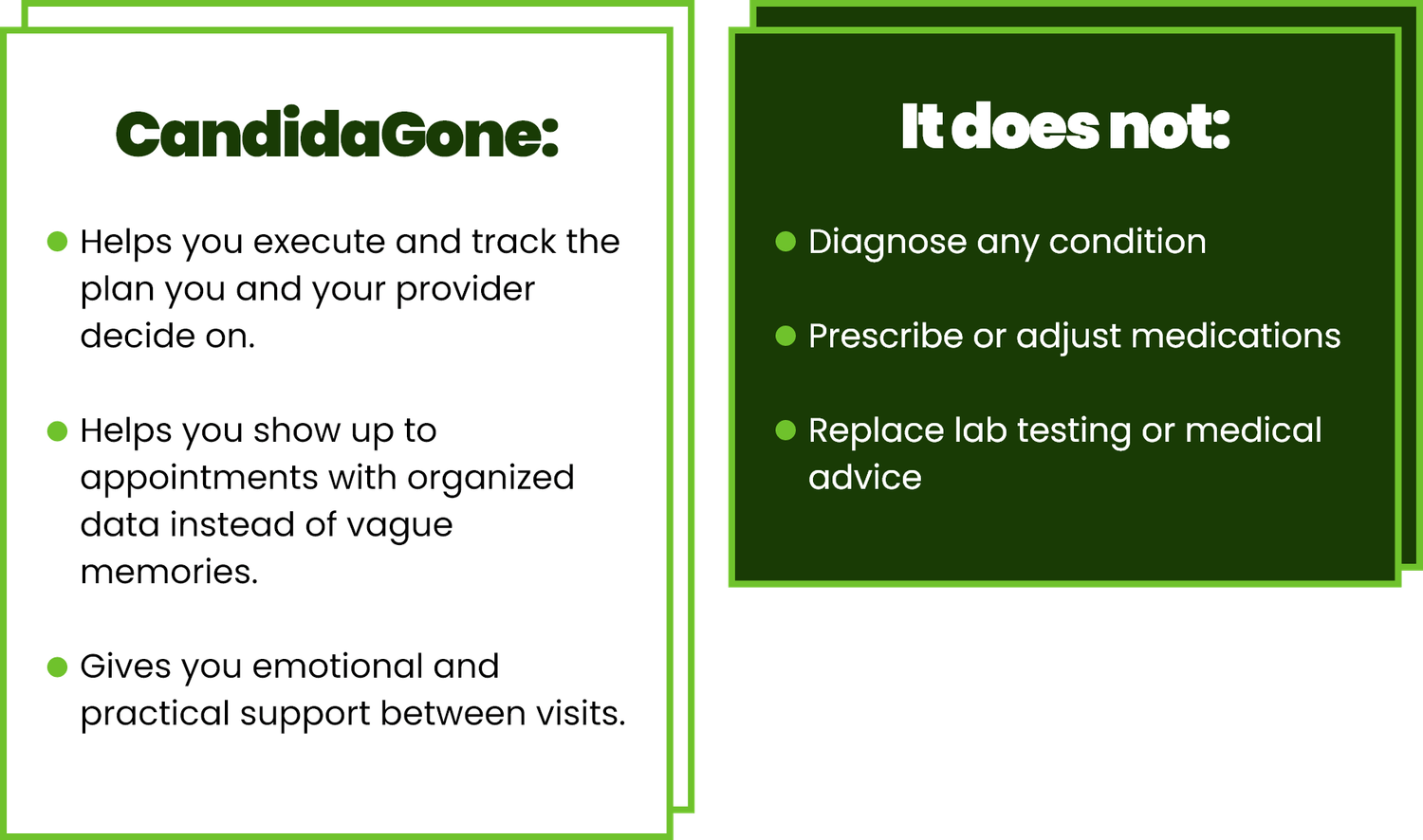 No. CandidaGone does not diagnose, treat, cure, or prevent any disease. It’s an educational and organizational support program that helps you follow a plan more consistently and communicate better with your healthcare provider.