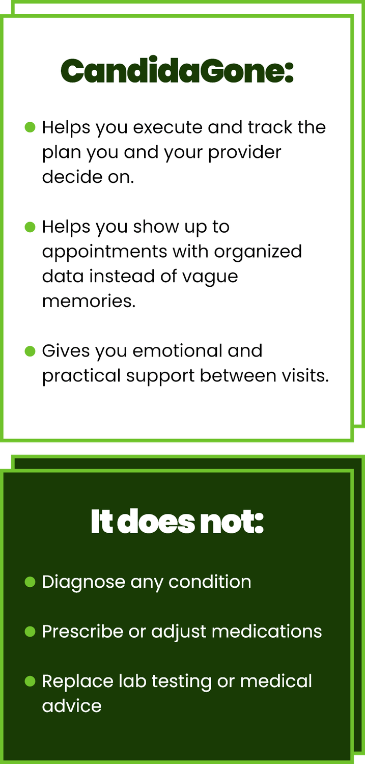 Important: CandidaGone is an educational and organizational support program. It does not diagnose, treat, cure, or prevent any disease and is not a substitute for medical care. Always work with your licensed healthcare provider.